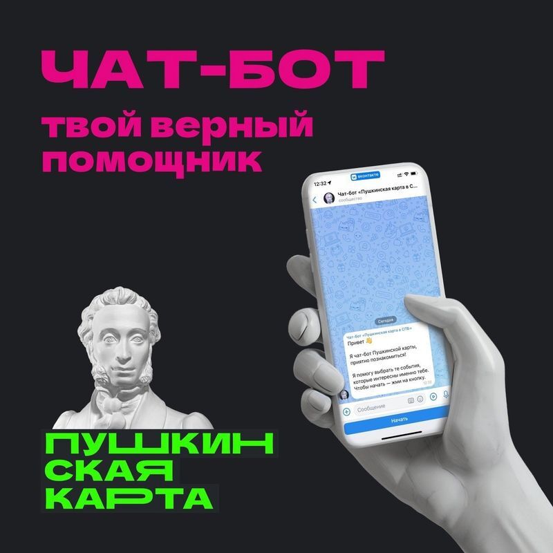 Чат-бот «Пушкинская карта» помогает находить и посещать культурные мероприятия (кино, концерты, экскурсии) по программе «Пушкинская карта».