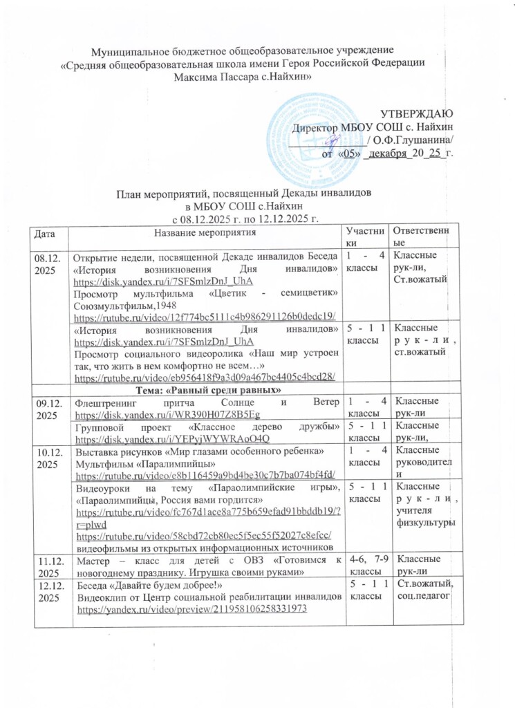 В целях привлечения внимания к вопросам инклюзии и повышения качества жизни людей с инвалидностью, формированию у обучающихся уважительного, гуманного отношения к людям с ограниченными возможностями здоровья, МБОУ СОШ с.Найхин предлагает План мероприятий посвященный Декады инвалидов МБОУ СОШ с.Найхин 2025